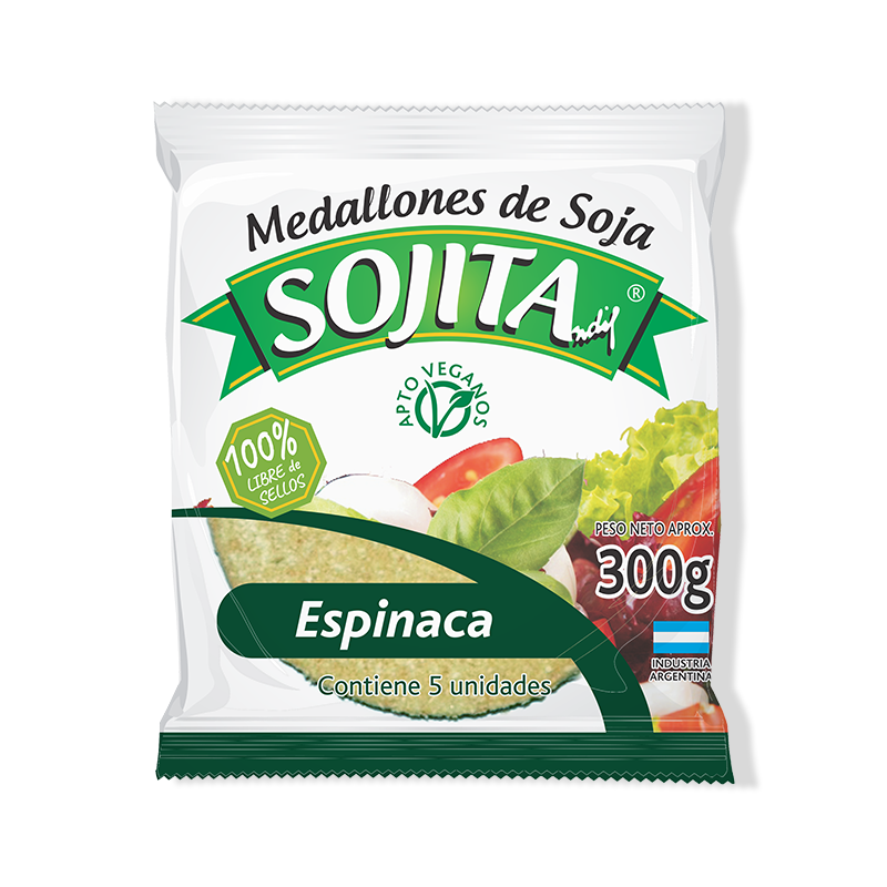 Exquisita Milanesa de Soja de verdura a base de harina de soja desgrasada, salvado de trigo y seleccionado perejil, aromático orégano y fresca espinaca, rica en proteínas vegetales y fibras, sin grasa ni colesterol, no contiene huevo ni sal agregada.